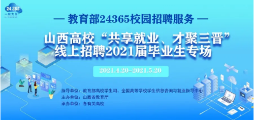 山西省教育厅从4月20日至5月31日全面开展教育部“24365就业招聘服务”—山西高校 “共享就业、才聚三晋”线上双选会系列招聘活动,本次活动由教育部高校学生司与全国高等学校学生信息咨询与就业指导中心指导,山西省教育厅主办,太原理工大学、山西大学、山西财经大学、山西医科大学、山西农业大学、山西师范大学六所高校联合省内各院校承办。